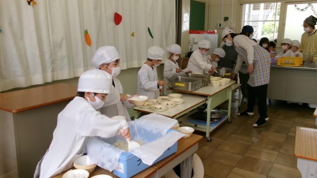 給食の準備をみんながして、当番さんが、ごはんやカレー、ツナサラダ、ソーセージなどを盛り付けました。