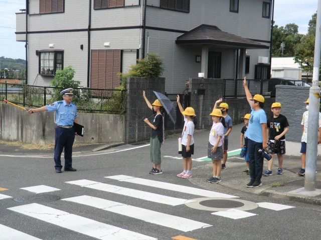 熱中症対策でコースを予定の半分にして歩行訓練を行いました。自分や仲間の命を守るための大事な授業です。暑い中でしたが、子どもたちは真剣に取り組んでくれました。
