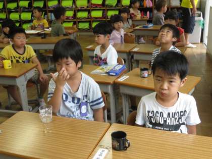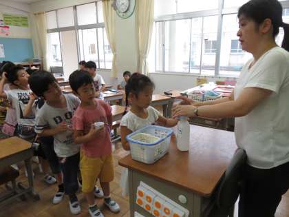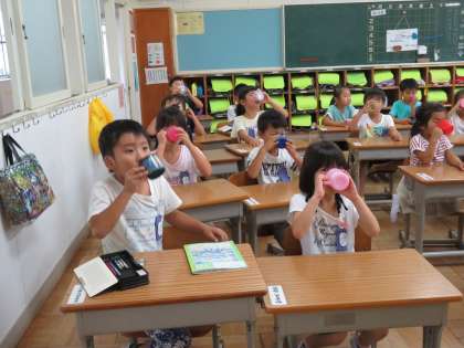 担任の先生から、フッ化物洗口をもらい、1分間ブクブクうがいをします。1年生も上手にできるようになりました。