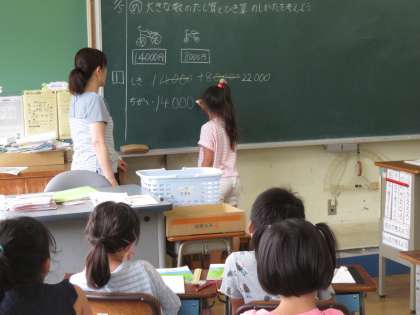 14,000+8,000のたし算とひき算の仕方を考えました。みんなで考えたり、周りの友だちと考えたりしながら、いろいろな方法が発表されました。