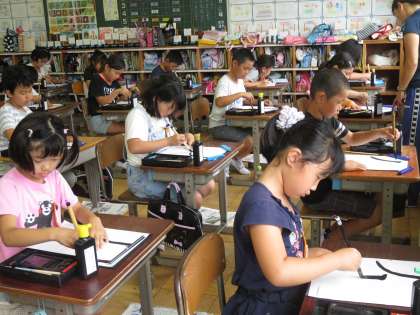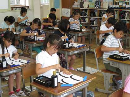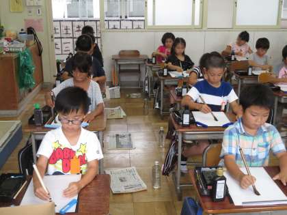 左払いの筆使いに気をつけて、「大」を書きます。最初は墨をつけず、次に墨をつけて「左払い」の練習、最後に「大」を書きました。