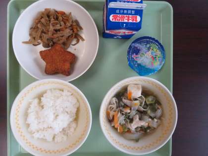 今日は、たなばた献立です。内容は、たなばた汁、星形ミンチカツ、五目きんぴら、たなばたゼリー、牛乳です。たなばたゼリーは、子どもたちに大人気でした。
