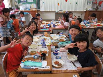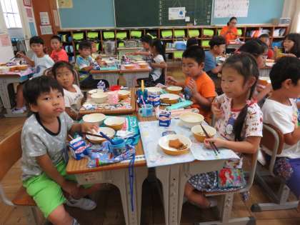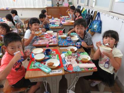 たなばた献立、みんなで楽しく、おいしくいただきました。「星」が、大きいおかずの中、ゼリーの中にも入っていました。子どもたち、気付いたでしょうか?
