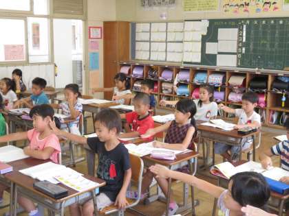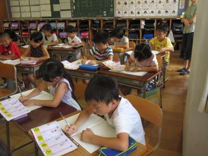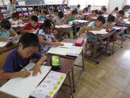 国語の新しい単元「ミリ—」に入ります。まずは、新出漢字の勉強です。先生が黒板に書くのを見る、手で空中に漢字を書く、ノートに書くという段階で、子どもたちは学習をしていきます。この時間は、「合う」「回てん」「歩く」「分ける」の4つを勉強しました。
