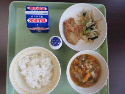 献立は、ピリカラ汁、あじフリッター、もやしのナムル、発酵乳、ご飯、牛乳です。