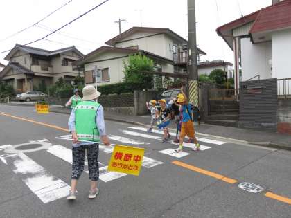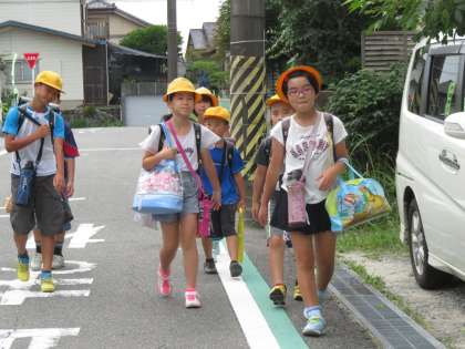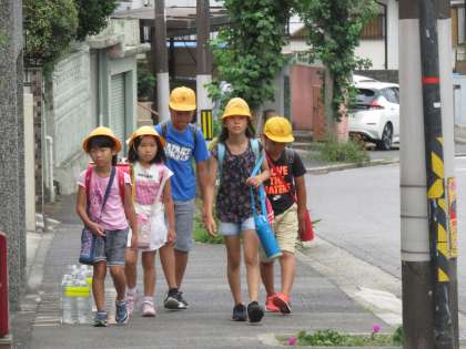 曇ってはいますが、湿度が高く蒸し暑い日です。地域の方にも見守られながら、登校します。