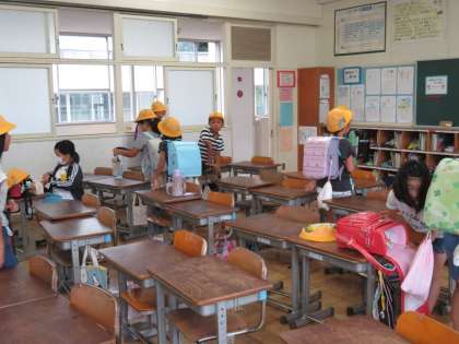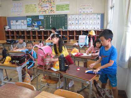 8時の教室の様子です。少しずつ子どもが教室に集まりだしました。担任の先生は、教室で子どもを出迎えています。