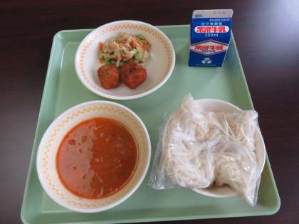 献立は、ミートソースかけ、かぼちゃフライ、えだまめとにんじんのサラダ、ソフトめん、牛乳です。最近の給食では、めん類のメニューに、うどんや中華めんが加わり、ソフトめんが出される回数が減ってきました。