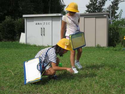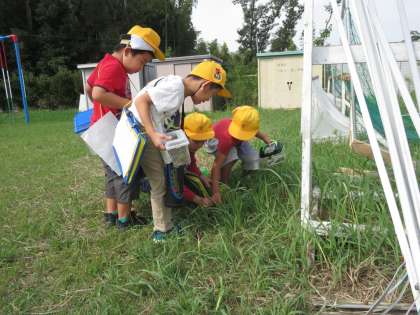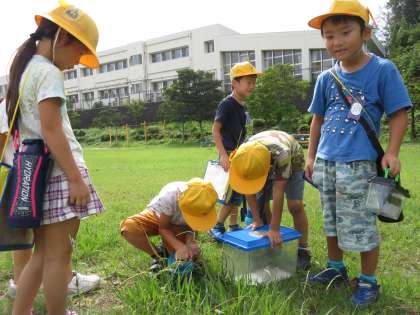 身近な生きものを探したり、飼ったりして、生きものに親しみをもち、大切にする心が育つことを目標にしています。今日は、運動場西側で、虫探しをしました。ショウリョウバッタ、イナゴ、コオロギなどの虫が見つかりました。