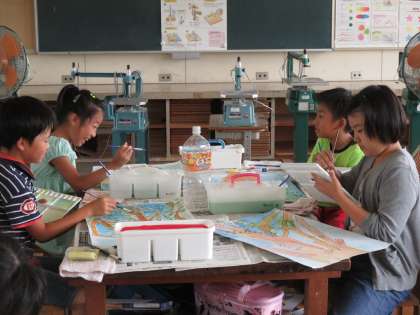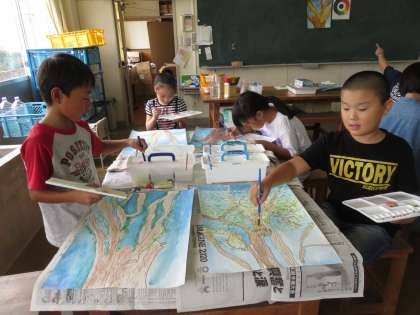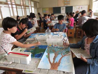 絵の具の使い方について学習し、色の三原色について知りました。色の三原色を意識しながら、スケッチした木の色塗りをしました。