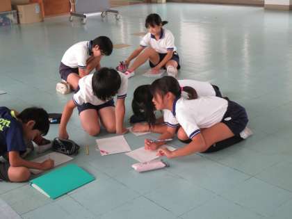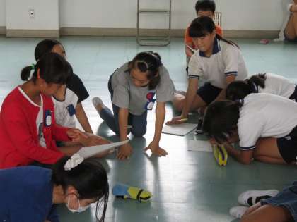大放課に班長会がありました。登校振り返りカードを使って、集合時刻、並び方、手あげ横断、あいさつの4点について振り返りをしました。その後、通学団担当の先生にチェックをしてもらいました。