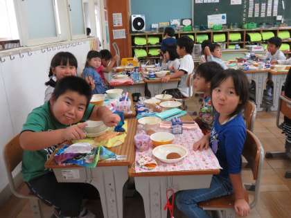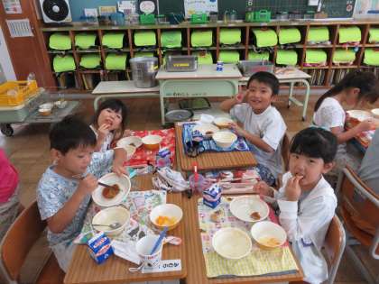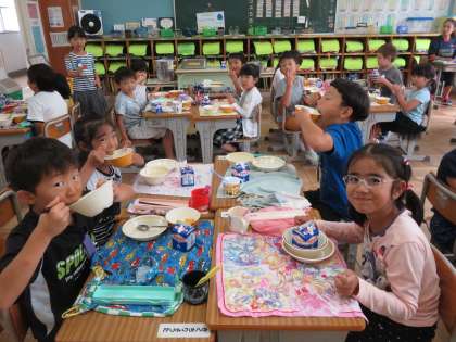 1年生の子どもたちも楽しそうに給食を食べています。残さず食べてくださいね。