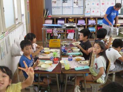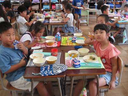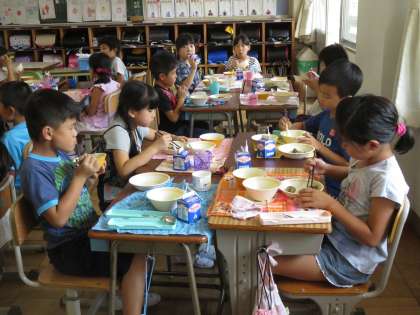 静かに行儀よく給食を食べています。いつも落ち着いた雰囲気の学級です。