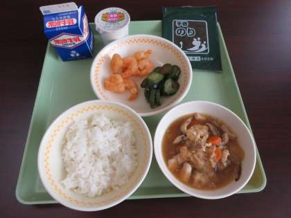 献立は、てんむす(小エビの天ぷら・手巻きのり)、とうがんじる、きゅうりのごまじょう油あえ、あいちのみかんゼリー、牛乳です。