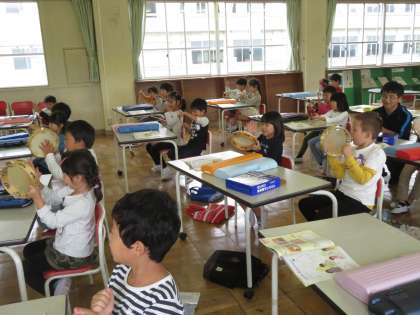 トライアングル、タンブリン、大だいこ、シンバルを使い、いろいろな音を出す工夫をしました。