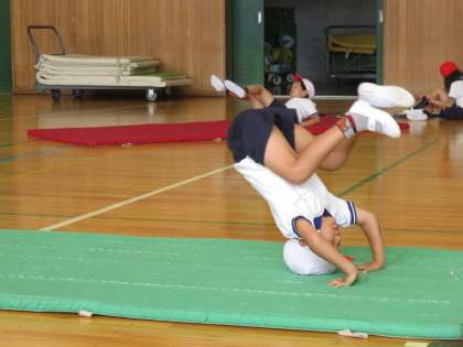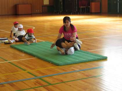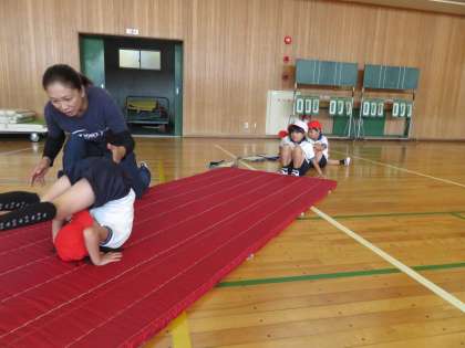 いよいよ前転、後転の練習に入りました。体を丸くして、なめらかに回れるようになるといいですね。