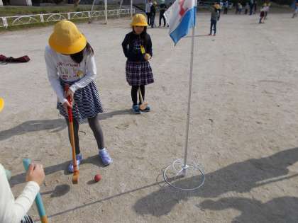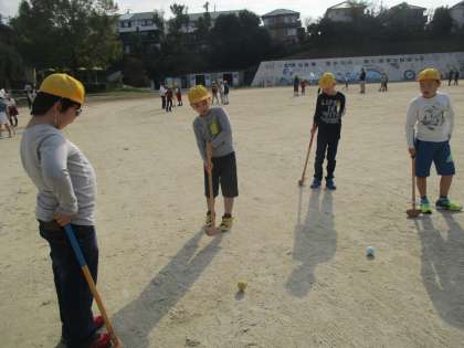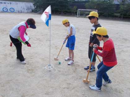 総合的な学習の時間で「高齢者 福祉」について勉強しています。今日は、9名の方に来ていただき、グランドゴルフの体験をしました。