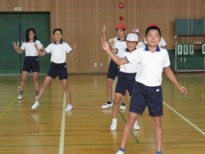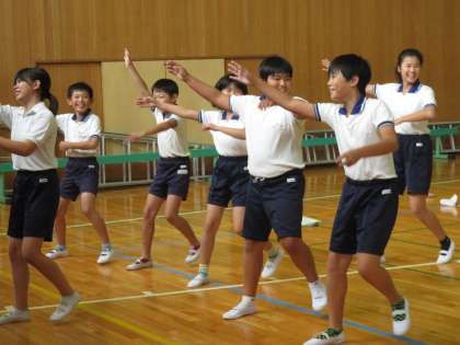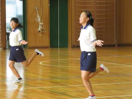 表現運動の単元で、曲に合わたエアロビクスの振り付けを班ごとに考えました。今日は、発表会です。班ごとの発表では、ステップやジャンプなどの動き、フォーメーションを工夫したエアロビクスが見られました。