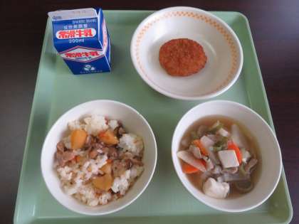 献立は、栗ときのこご飯、けんちん汁、キャベツ入りミンチカツ、牛乳です。