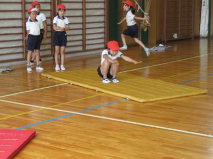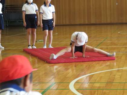 前転、開脚前転の練習をしました。体が柔らい子が多く、きれいに開脚前転をする子もいました。