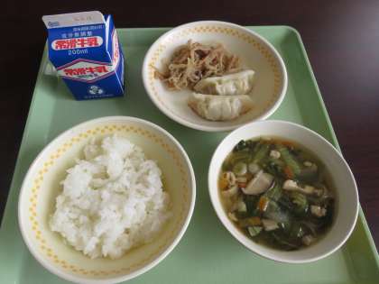 献立は、ワンタンスープ、ギョウザ、もやしとメンマのいためもの、ご飯、牛乳です。