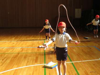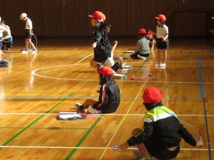なわとび大会に向けて体育の授業では、なわとびの練習をしています。2人1組になって、なわとびカードの検定をしています。