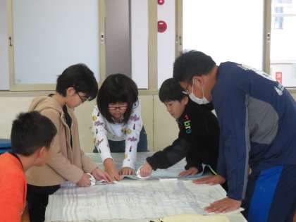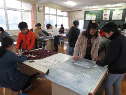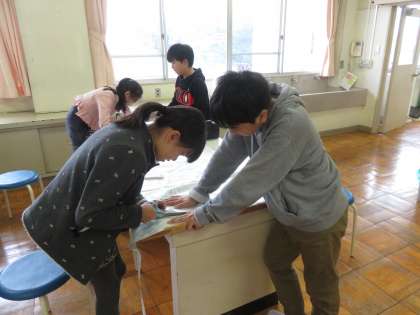 エプロンづくりが始りました。先生の説明を聞いた後、2人1組になって、布を切りました。