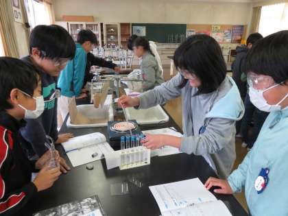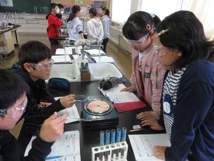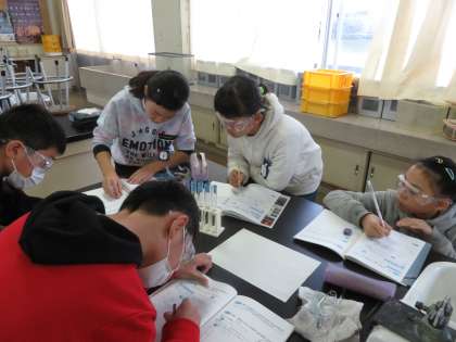 塩酸・炭酸水・食塩水・石灰水・アンモニア水の性質の違いを調べます。見た様子、におい、水を蒸発させたときの様子を調べます。まず、結果を予想し、それから実験に入ります。安全のために、ゴーグルをかけています。