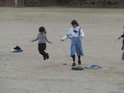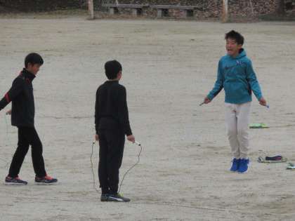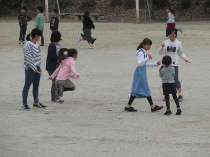 運動場では、今日も縄跳びの練習をしている子どもの姿が見られます。よく見てみると、1年生と6年生が仲よく一緒に練習していました。