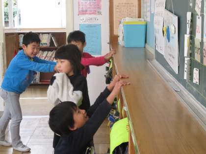 係の仕事で黒板を消す子、友だちと遊ぶ子、そして、ストーブの周りに集まる大勢の子などそれぞれです。でも、放課の時間は、ストーブついていないですけど・・。暖かいのかな?