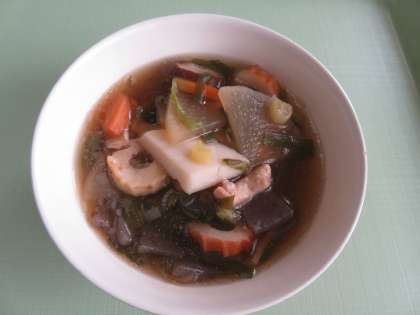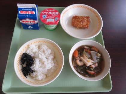 献立は、のっぺい汁、けんちんしのだのごまだれかけ、しそひじきのつくだ煮、ヨーグルト、ご飯、牛乳です。