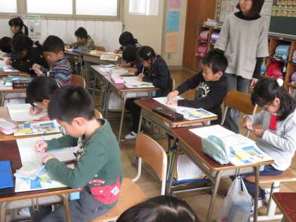 物のかどの形を調べます。特に、教科書の角、ノートの角など直角の物を探しました。