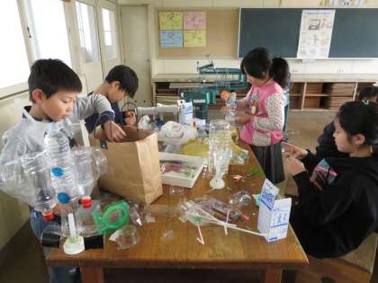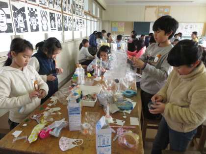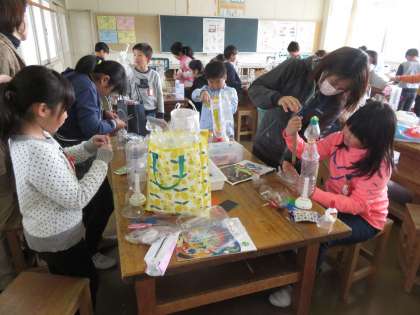 ペットボトルや透明のパック等を使い、光の通るクリスタルファンタジーを作っています。今日で完成です。