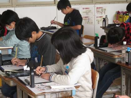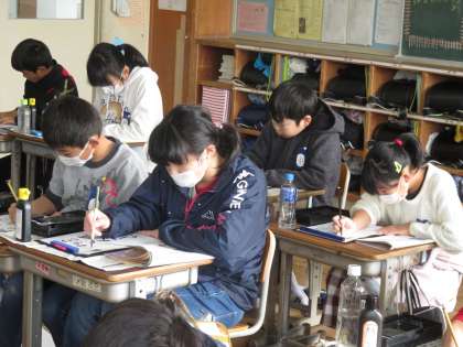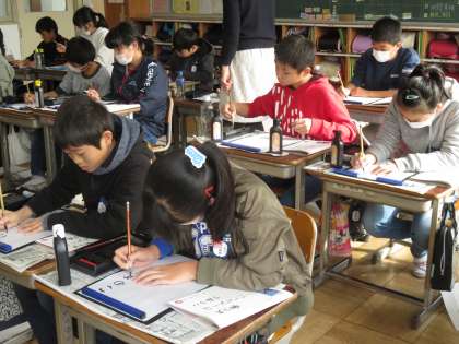 ひらがなと漢字の大きさ、行間と字のバランスに気をつけ、「この道や 行く人なしに 秋の暮」を書きました。小筆で書くのは難しいですよね。