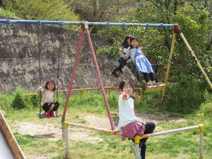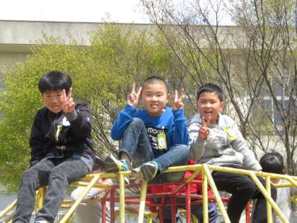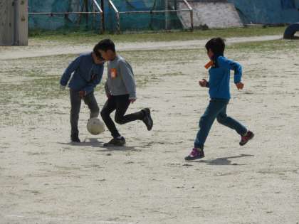 春らしい陽気になりました。運動場で、子どもたちは元気に遊んでいます。
