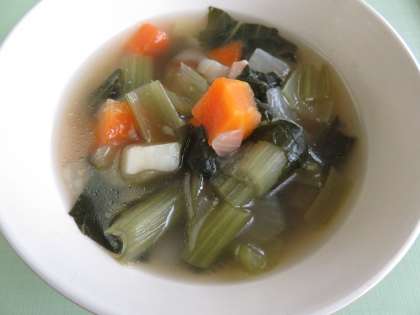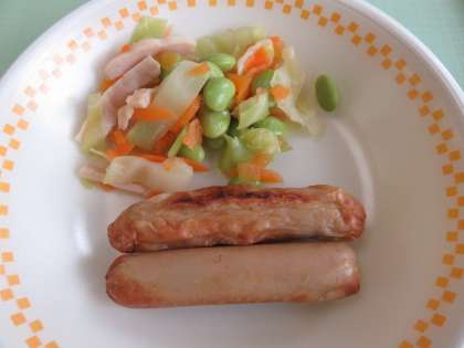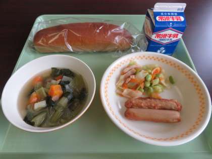 献立は、やさいスープ、あいちポークのウインナー、えだまめとにんじんのサラダ、クロロール、牛乳です。