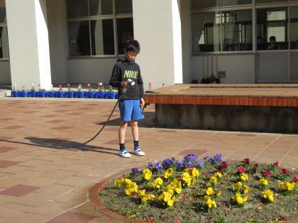 委員会の当番活動で、きれいに咲いたパンジーに、水をかけてくれています。朝から、ありがとう。