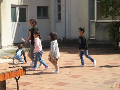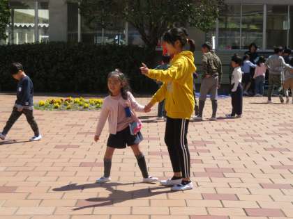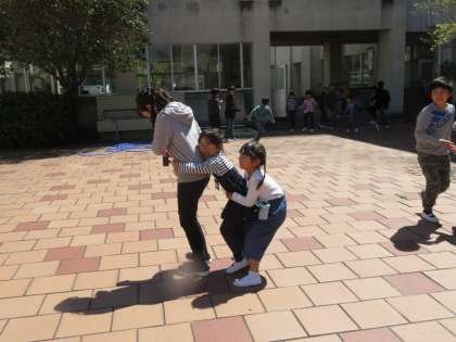 大放課に、さんさん広場で、担任の先生・6年生・支援員さんたちと楽しく遊んでいます。