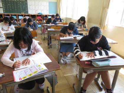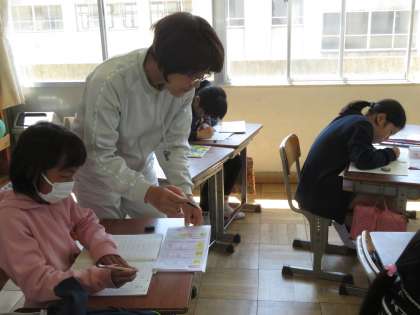 男子は、保健室で視力検査をしていました。女子は、教室で漢字の練習です。