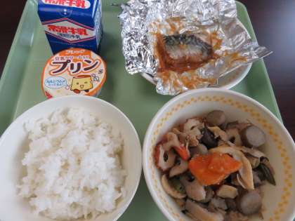 献立は、ちくぜんに、サバのぎんがみ焼き、豆乳プリン、ご飯、牛乳です。1年生は親子会食会を実施しました。1年生の保護者の皆様、サバのぎんがみ焼きは、いかがでしたか?
