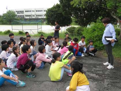 1時間ごとの気温の変化を測ります。気温の測定後、百葉箱の説明を聞きました。