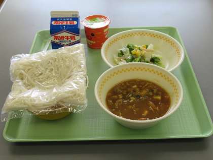 今日のメニューは、牛乳、ソフトめん、カレー南蛮、アスパラサラダ、野菜ゼリーでした。
