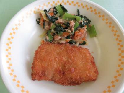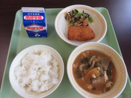 献立は、新たまねぎのみそ汁、ささみうめしそフライ、こまつなとかつおのあえもの、ご飯、牛乳です。