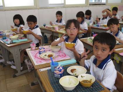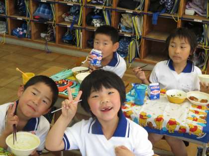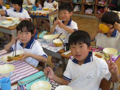 5時間目に内科検診をするため、体操服で給食を食べました。