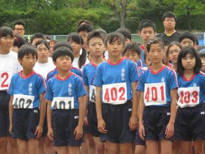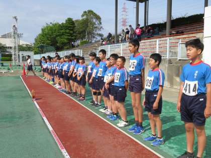 第49回知多市小中陸上競技大会が知多市運動公園陸上競技場で行われました。5・6年生の代表児童が参加しました。競技開始前、開会式の様子です。