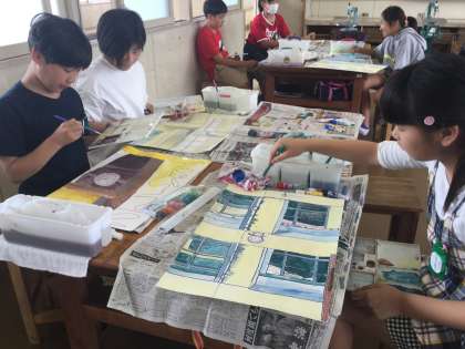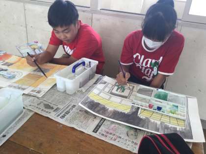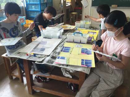 外に行って描いた学校の絵に絵の具で色をぬりました。