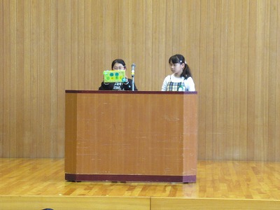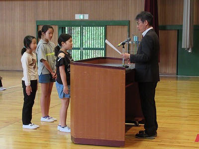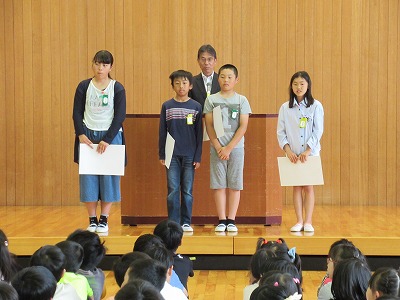 今日の朝会では、小中陸上競技大会の表彰、バドミントンとバレーボールの表彰をしました。その後は、校長先生のお話、環境委員会からの連絡がありました。環境委員会からは、緑のはね募金、トイレのスリッパをそろえよう週間についての連絡でした。