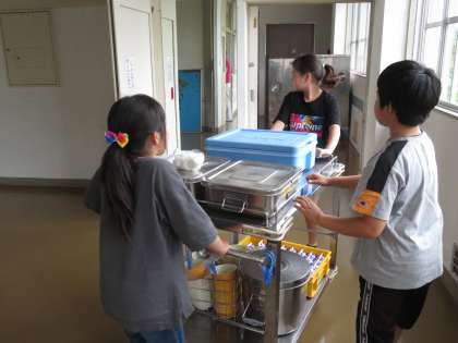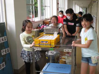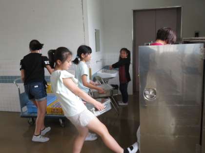 給食が終わりました。給食当番が配膳室まで食器を運びます。