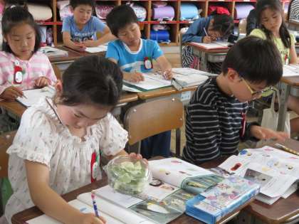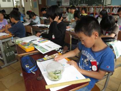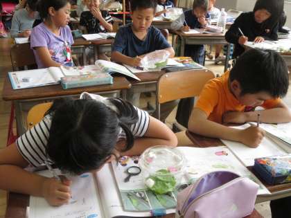 教室で飼っているちょうちょのさなぎの観察をしました。よく見て、理科ノートに気づいたことを記入します。