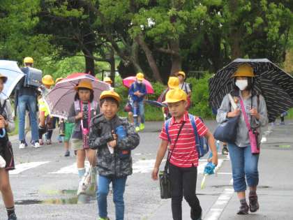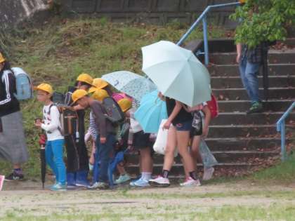 登校時間帯には、雨も小降りになりました。今日は、4年生がリサイクルプラザ見学に出かけます。